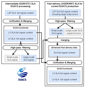 Nevertheless, they are not always coherent at large regional scales due to various sources of geographically correlated errors (instrumental, processing, orbit residuals errors). Consequently, the DUACS multi-mission cross-calibration algorithm aims to reduce these errors in order to generate a global, consistent and accurate dataset for all altimeter constellations. This processing step consists of applying the Orbit Error Reduction (OER) algorithm. This process consists of reducing orbit errors through a global minimization of the crossover differences observed for the reference mission, and between the reference and other missions also identified as complementary and opportunity missions Traon and Ogor (1998). Multi-satellite crossover determination is performed on a daily basis. All altimeter fields (measurement, corrections and other fields such as bathymetry, MSS, etc.) are interpolated at crossover locations and dates. Crossovers are then appended to the existing crossover database as more altimeter data become available. This crossover dataset is the input of the OER method. Using the precision of the reference mission orbit (Topex/Jason series), an accurate orbit error can be estimated. This processing step is applied on GDR/NTC as well as on IGDR/STC measurements, except for some missions that present a high error level at long wavelengths (e.g., H2C). It does not concern either OGDR/NRT measurements. Specifically, to the OGDR measurements and [I]GDR measurements processing for some specific missions, the DUACS system includes SLA filtering. The reduced quality of the orbit solution indeed limits the use of the long-wavelength signal with these products. The DUACS processing extracts from these data sets the short scales (< ~900 km) which are useful to better describe the ocean variability in real time, and merges this information with a fair description of large-scale signals provided by the multi-satellite observation (i.e., L4 product) in near real time. Finally, a “hybrid” SLA is computed. This specific processing is summarized in the following figure.